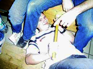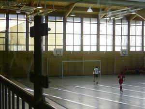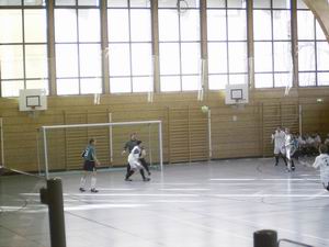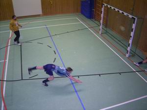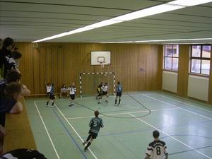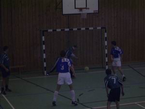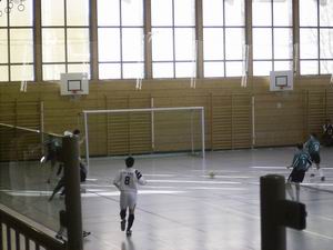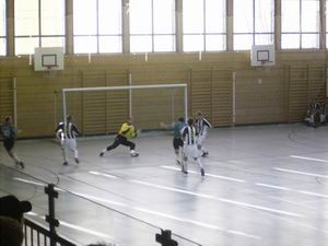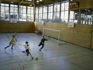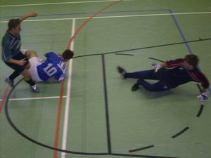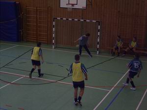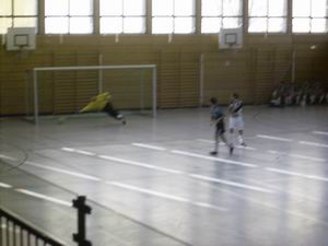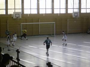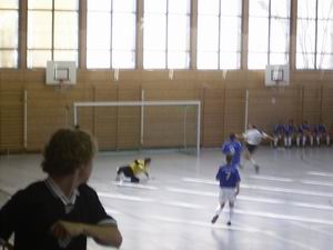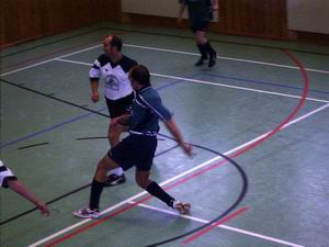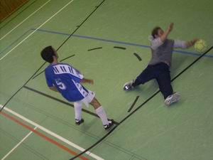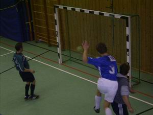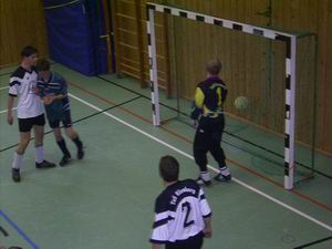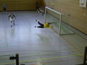 | Und wieder schepperts - insgesamt 91 mal an diesem Tag. | Das "Oldie"-Duell zwischen Sepp Heiss und Jacky Buchner (fesch schaut er aus im Reserve-Dress). | Auch A-Jugend-Spieler Stefan Kaltenhauser konnte dem zum Teil sehr glatten Hallenboden nicht "standhalten" - zum Schluss reichte es nur zum 3. Platz für den Tournierfavoriten. |