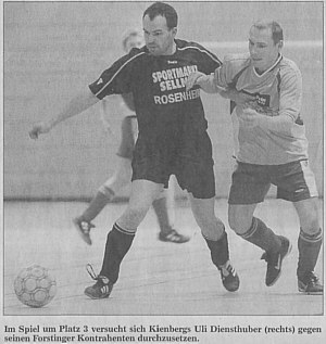 Trostberg. Große Spannung bis zum vorletzten Match war bei der vierten und letzten Vorrunde des 40. Trostberger Hallenfußball-Turniers um den Sparkassen-Cup angesagt. Nach dem Modus „Jeder gegen jeden" erreichten schließlich der Kreisligist SV Forsting und der A-Klassen-Vertreter TuS Kienberg die Endrunde, die am kommenden Samstag in der Trostberger Landkreishalle ausgetragen wird.