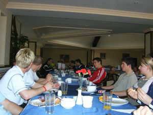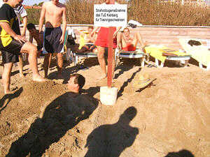 Nach einer Stunde kam man in Salzburg an und gleichzeitig auch die Nachricht, dass unser Flieger vorverlegt wurde und bereits um 9:30 Uhr abheben sollte. Da das Flugzeug in Antalya aber wegen technischer Probleme nochmals umkehren musste (mit der Mannschaft des TSV Peterskirchen an Bord) verschob sich unser Flug letztlich von 11 Uhr auf 13:40 Uhr. Nach 3 Stunden Flug dann Ankunft in Antalya gegen 19:00 Uhr abends und Transport zum Hotel Papillon Belvil nahe Belek. Der erste Abend verging dann mit Einchecken, Zimmer beziehen, Abendessen und Abschluss an der Bar relativ schnell. Die folgenden Tage waren geprägt von 20-minütigen Joggingeinheiten um 7:30 Uhr morgens, Frühstück, laufintensivem 1 ½-stündigem Vormittagstraining, Mittagessen und –ruhe, wieder 1½ Stunden Nachmittagstraining, Entspannen in Whirlpool, Sauna, türkischem Dampfbad oder bei Massagen. Auch die sonstigen Angebote im Hotel wie Poolbillard, Entspannen am Strand, Beachvolleyball oder der Fitnessraum wurden bestens genutzt. Neben den sportlichen Verbesserungen und Taktikschulungen kam auch die soziale Komponente nicht zu kurz und in kurzer Zeit wuchs die Mannschaft noch stärker zusammen. Trotz des vorhandenen Angebots an Spirituosen und nächtlichen Beschäftigungsmöglichkeiten war die Disziplin bis zuletzt sehr gut, lediglich am letzten Tag mussten härtere Bestrafungsmaßnahmen ergriffen und 2 Spieler am Strand verbuddelt werden, nachdem sie am Vormittag das lockere Joggingprogramm bewusst oder unbewusst (bewusstlos???) geschwänzt hatten. Mitte der Woche wurde ein Freundschaftsspiel gegen die türkische Kreisligamannschaft von SV Ataspor München absolviert. Der Nachmittag wurde dann geschlossen in Antalya verbracht, wo zunächst ein Rundgang durchs Hafenviertel und später der Besuch des Volksbasars anstand. Gegen die immer schwerer werdenden Beine hatte man mit den beiden Physiotherapeutinnen Lili und Regina genau das richtige Mittel und so hielten sich die Ausfälle in Grenzen. Der Großteil der Mannschaft konnte somit an den meisten bzw. allen der insgesamt 11 Trainingseinheiten teilnehmen. Am Donnerstag dann der große Auftritt unseres Spielführers Stefan Egger und unseres Youngsters Heli Frisch jr., die beim Abendevent in einer Tarzanshow auftraten und mit einem Doppelsieg einen vollen Erfolg für den TuS feierten. Im anschließenden Sektspiel dann ein weiterer Erfolg: Stefan Daschiel und Tom Giel konnten für den TuS noch eine Flasche Weißwein gewinnen.