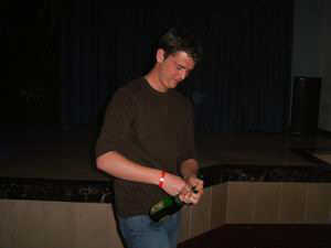 - Stefan Daschiel mit der gewonnenen Weinflasche beim „Champagnerspiel“