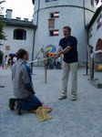 | Vogt Jacky, Hofnarr Dominik und Mundschenk Helmut. | Dominik in seinem Element. | |